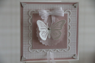 Fran asked us to create a card inspired by the photo using lilac, yellow, blue, kraft and a butterfly. I had this idea in my head as soon as I saw the photo, but it took a very long time to do my card... I had to make the background twice, but I think it is quite nice now. The flowers are made with a Sizzix Flowers 3-D die and I painted them with Distress Ink (milled lavender). I also put a yellow brad in the middle of them. The background is made with the Waltzingmouse Gingham & Co stamp set and the little eggs from the Nestie Eggs stamp set. The heart on the little tag is from the Make Your Mark stamp set. The blue and the yellow butterflies are made with a Crealies die. I hope you like it!